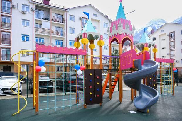 —Детская площадка с новым игровым оборудованием, парковой мебелью и безопасным резиновым покрытием